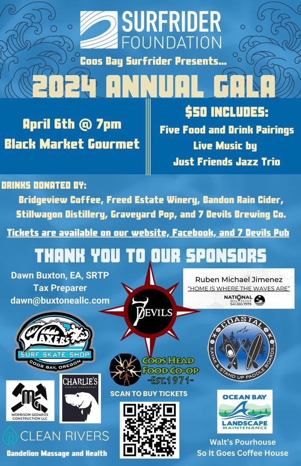 Surfrider Gala 2024! — Come join us for a night of celebration and support for our oceans. The **Surfrider Gala** is back and better than ever, with live music from Just Friends, delicious food, and inspiring speakers. Show your love for the sea and mingle with fellow ocean enthusiasts. Let’s make a splash together! https://allevents.in/coos%20bay/2024-annual-surfrider-gala/200026287863906